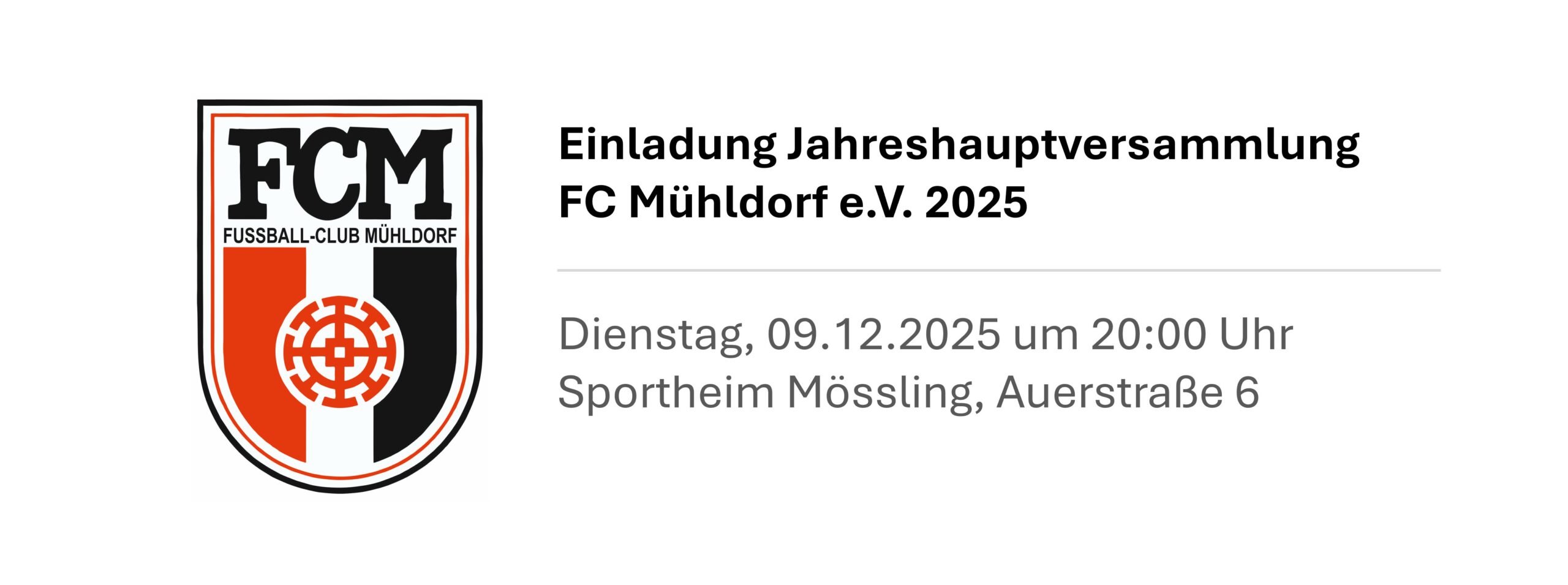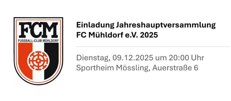 der Vorstand des FC Mühldorf e.V. lädt Sie recht herzlich zur Jahreshauptversammlung 2025 am Dienstag, den 09.12.2025 um 20:00 Uhr im Sportheim Mössling, Auerstraße 6 in 84453 Mühldorf ein.